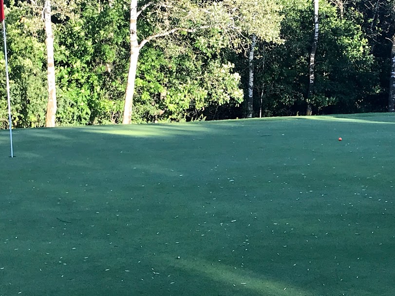 Not that anyone should applaud my skills because the hole before I lost 2 balls in the woods and hole 9, I lost my favorite pink ball in the woods — so hot and cold!