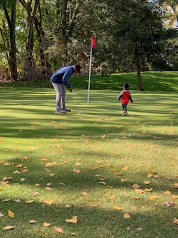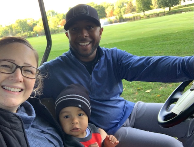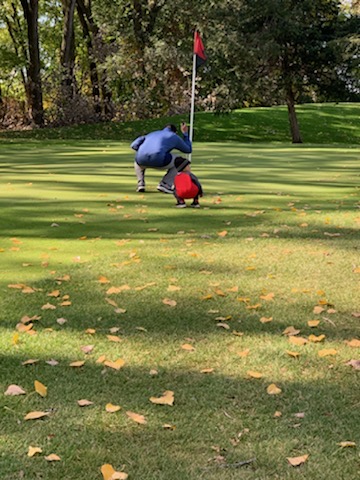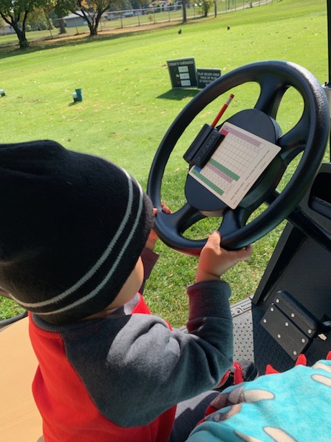 Last Sunday, during the Vikings game….because they really have not done well lately, Jackie and Jaxen went with Jermar while he went golfing. He knew since it was during the game, the golf course would be quiet and ok for Jaxen to tag along. Looks like there may be a new golfer in training! He was even helping Jermar line up his putt!