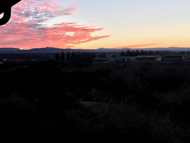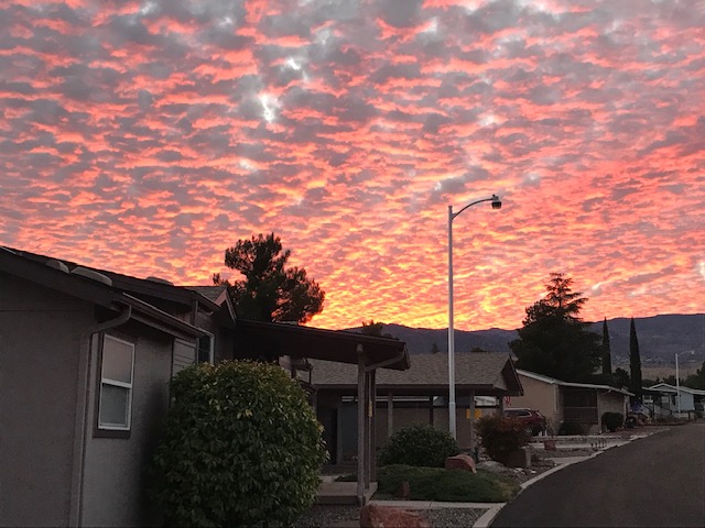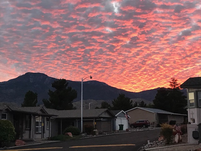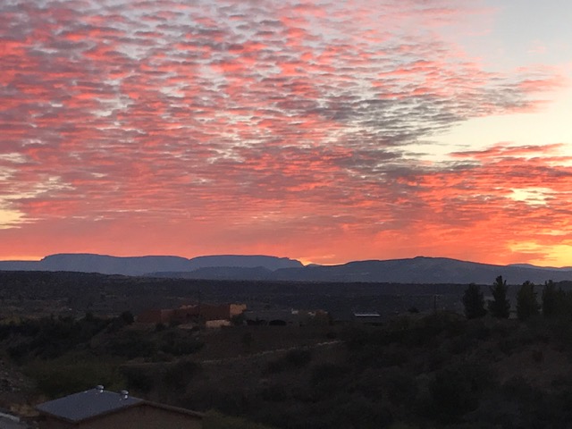 As I have indicated in the past, the sun rises here are so great to watch as they come over the red hills of Sedona. But since we have been here, there has been little cloud cover so we have not seen any colorful sunrises or sunsets. But last week, we finally got a little bit of rain, which made for some spectacular sunrises and sunsets. We actually had quite the thunderstorm when we were out on the deck watching the storm and the lighting was like a ball of light and then immediate thunder — loudest I have ever heard! Even fried our modem. But those storms helped produced these in the morning and at night!