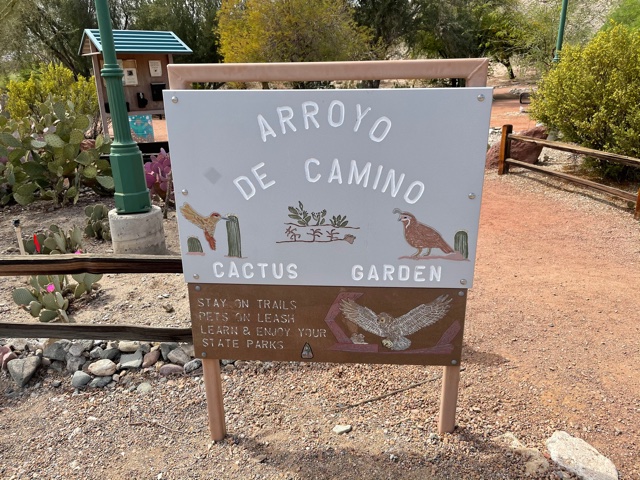 As we were leaving the state park, we stopped at a Cactus Garden, which provided a number of the local cactus plants — some were very interesting. It was 102 when we were there so we did not stay too long.