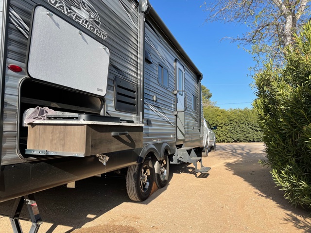 As you can see it works, since there is water dripping down. So we only turn on the full camper water as we need it and let the water drip. It is a hassle turning the water on and off, but best we can do. We did call a mobile RV service to try to get them to come out and fix it, but they did not return the call. I will have to say I think Jayco took some short cuts with these water lines, because as you pull the drawer in and out the lines naturally kink and eventually the kink gets a break in in. Looking on one of the Jayco Facebook pages, I found a number of people that had the same issue and many that ended up replacing the lines with better water hoses. That is what we will do when we get back to the Cottonwood house and maybe even add turn off valves so the water can be turned off just to this location. We are certainly glad we did not encounter this on our long trip back to MN.