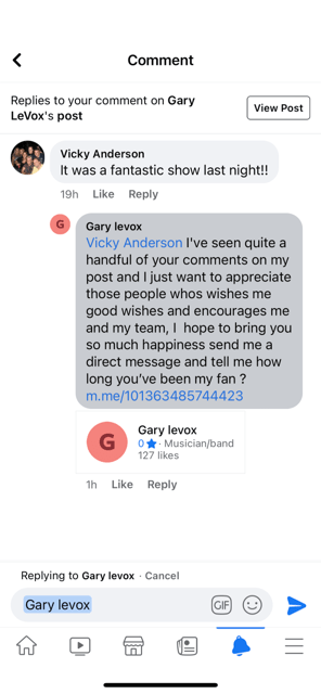 Oh my gosh, it was a fake Gary LeVox Facebook page!!! LOL I said if I responded to him as he suggested he would probably ask me if he could borrow $5K for his body guards hospital bills since his millions have been mistakenly frozen and would be unfrozen in a couple of days and he would then pay me back!!! (Another Tinder Swindler!!) I should have messaged and played along!! LOL