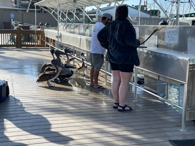 At one point, the crewman through out some skin and 2 pelicans were fighting over it and were in about a 5 minute stare down trying to get possession of this piece of skin. Finally the one pelican pulled it and flew away while about 10 pelicans followed him trying to get a piece of that skin!!