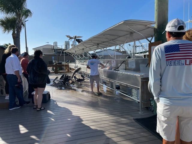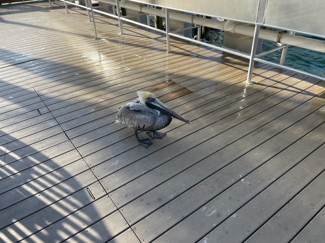 While sitting there, one of the fishing boats came in and the people had caught a small shark. So we watched as the crewman fileted that shark for the people. What was most fascinating were the pelicans that surrounded this crewman as he cleaned the fish. They actually got very aggressive jumping up on the cleaning counter where the man sprayed him to get him off the ledge.