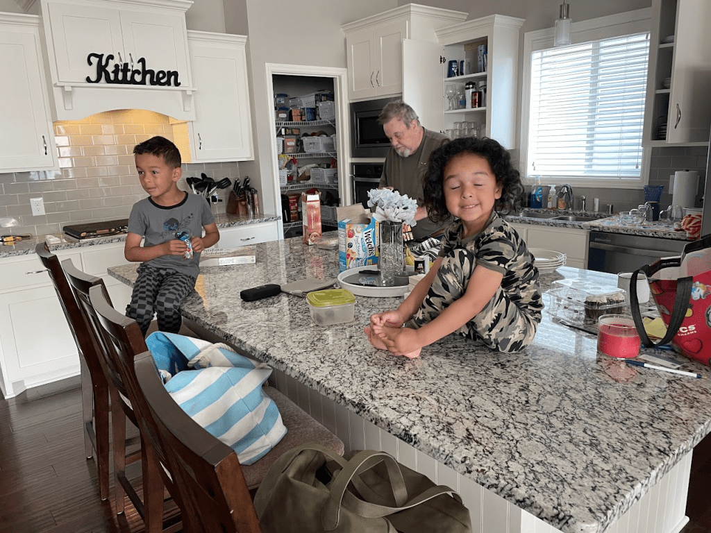 They love to sit on the kitchen island while we are making breakfast. It wasn’t one of Bumpa’s famous breakfast as we had Eggos and microwave bacon.